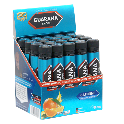 W Guarana 1,800 shots użyliśmy najlepszej jakości guarany o wysokiej zawartości kofeiny i najlepszym smaku. Forma płynna pozwala na szybsze działanie niż tabletki lub kapsułki, ale bez wpływu na dłuższy efekt. Z 1,800 mg wysoce skoncentrowanego ekstraktu z guarany, otrzymujesz jedno z najwyższych dawek na rynku. 180 mg kofeiny z długotrwałym działaniem odpowiada 2-3 filiżankom kawy filtrowanej.